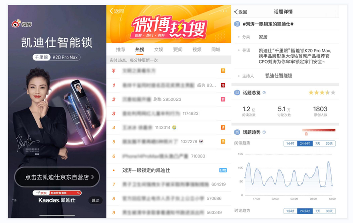 在微博端,7月20日,凯迪仕智能锁“千里眼”K20Pro Max强势登陆微博开屏页面,随之当代年轻人安全感话题引发网友讨论,#刘涛一眼锁定的凯迪仕#稳居微博高位热搜第6位,阅读量突破1.2亿,引发5.1W人在线热议。