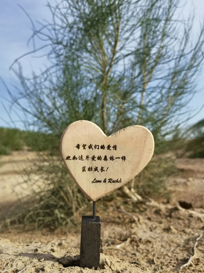 除了植树之外,如果客户愿意放弃外包装,一起声援环保,我们就会给他一棵梭梭树的冠名和留言权,可以为他们免费定制爱心留言小牌插在树旁,并返图给客户。同时,我们在联系老客户参与其中。
