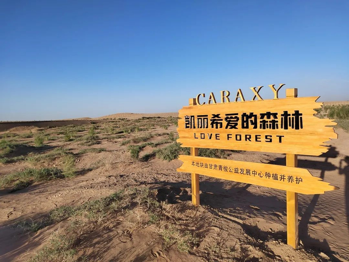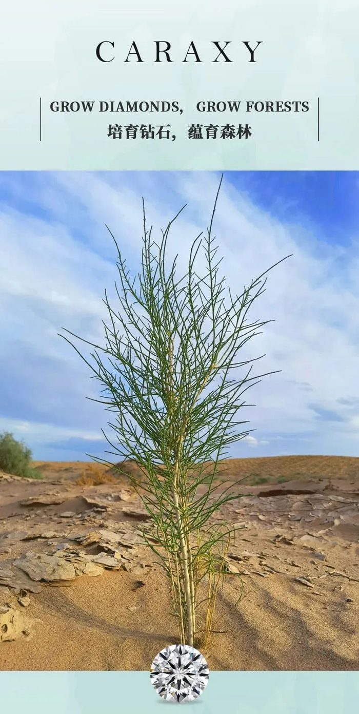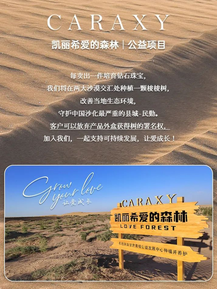 据介绍,“爱的森林”(Love Forest)公益项目是CARAXY与甘肃省红十字会、甘肃青梭公益发展中心合作推出。CARAXY表示,未来每卖出一件培育钻石珠宝,就在中国西北地区,巴丹吉林沙漠和腾格里沙漠两大沙漠交汇处,种植1棵梭梭树,以改善生态环境,守护中国沙化最严重的民勤县。