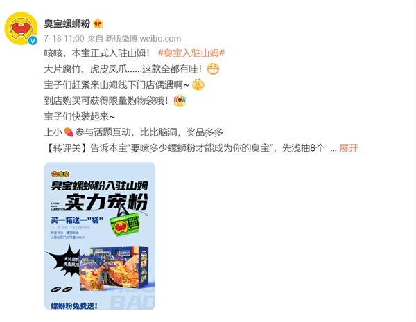 线下活动现场,趣味的互动体验、以臭宝IP为设计元素的活力空间氛围、有料有趣的爆款产品,让臭宝打破了空间限制,实现了品牌的多渠道出圈。据悉,臭宝螺蛳粉除主流电商平台和社交电商外,线下渠道覆盖了20个省区,铺货近万家门店。臭宝运营团队线下渠道的实力也体现在渠道的多,近日臭宝官方微博也宣布臭宝螺蛳粉正式入驻山姆,这意味着臭宝螺蛳粉在成为山姆合作螺蛳粉品牌的同时,也拓宽了针对不同消费的线下渠道。