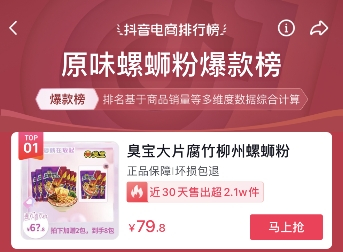 据了解,臭宝螺蛳粉拥有研发、生产、销售等完整供应链闭环,并通过持续的产品创新升级、营销与渠道活动等规划加深多渠道与消费者的联系。这一方面满足了消费者对螺蛳粉的多元化需求,另一方面也形成了臭宝品牌独特的竞争壁垒。因此臭宝自产品上线便迅速成为了螺蛳粉品牌中的“黑马”,根据公开信息,臭宝螺蛳粉多次登上抖音电商排行榜TOP1;而且一经进入线下渠道也受到了广大消费者的青睐和认可。