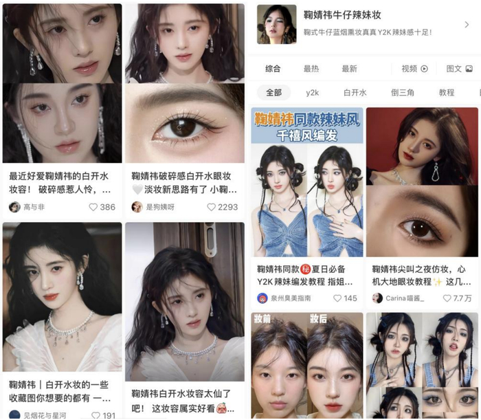 谈起鞠婧祎,大家应该不会陌生。各大时尚媒体的妆教常客,不光是剧里的古装造型在线,平日里的装扮也称得上是教科书式的变美教材,甚至,之前不少造型都成为了各大博主争先拍摄仿妆的素材。“鞠婧祎仿妆“显然已经成为众多美妆博主的“流量密码,Y2K仿妆、白开水妆容,只要是鞠婧祎尝试过的妆容,都会掀起一阵仿妆风潮。