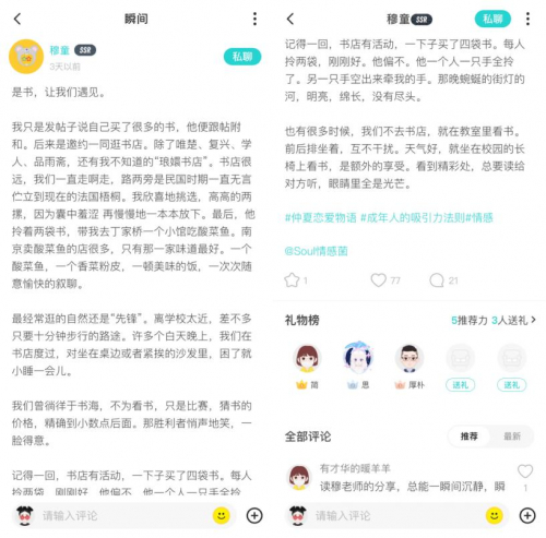 “是书,让我们遇见。”用户@穆童 在Soul上写到,当初只是发了一条帖子,他跟帖。于是两个人相识,后来一起邀约逛书店、聊天、徜徉于书海……