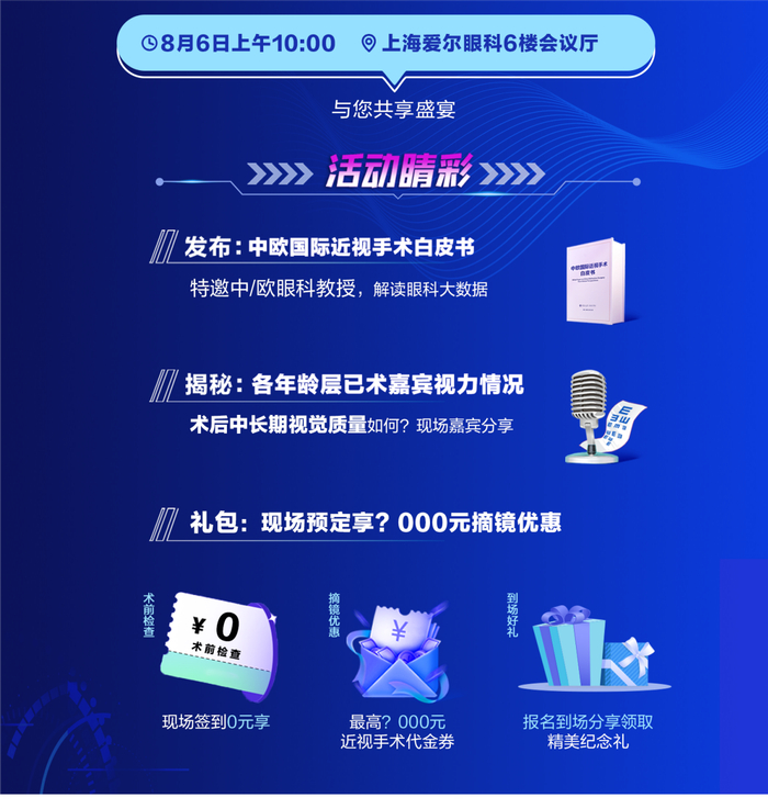 上海爱尔眼科医院于8月6日早上10:00在6楼屈光科会议厅举行《中、欧国际近视手术白皮书》发布会--上海站,于此,2021年,爱尔眼科在业内率先发布《国人近视手术白皮书》。2022年,值此爱尔眼科成立20周年之际,白皮书将再次升级——中南大学爱尔眼科学院将联合爱尔眼科研究所,共同发布《2022中、欧近视手术白皮书》(以下简称《白皮书》)。
