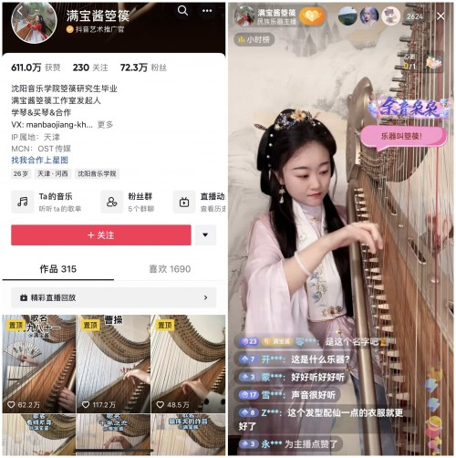 “这是竖琴吗?”直播间有人提问。“这是箜篌,是我们中国人的乐器。”胡雪菲回答道。随后一个半小时的直播中,她用这把乐器演奏了《一路生花》《无羁》《菊次郎的夏天》等十来首歌曲,吸引了超6万人次观看。两年来,通过在自己的抖音账号@满宝酱箜篌 直播弹奏箜篌,胡雪菲不仅让更多人知晓了这一小众的民族乐器,更借助直播打赏的收入,让自己的生活和事业得以正常运转。