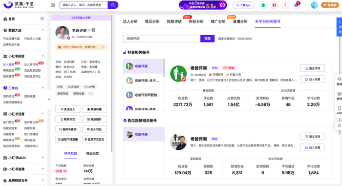 初步找到优质的西瓜视频创作人后,还可以对其进行创作人分析、视频分析、粉丝分析、互动分析等全方位的评估。通过“创作人分析”可以获得创作人的整体数据和增长趋势,并与粉丝量相近的达人进行数据对比;通过“视频分析”则可以找到创作人数据最优的视频类型;通过“粉丝分析”和“互动分析”则可以了解创作人覆盖的用户群体。当使用者发现与品牌目标用户人群相符的创作人后,还可以加入收藏,方便后续追踪和投放。
