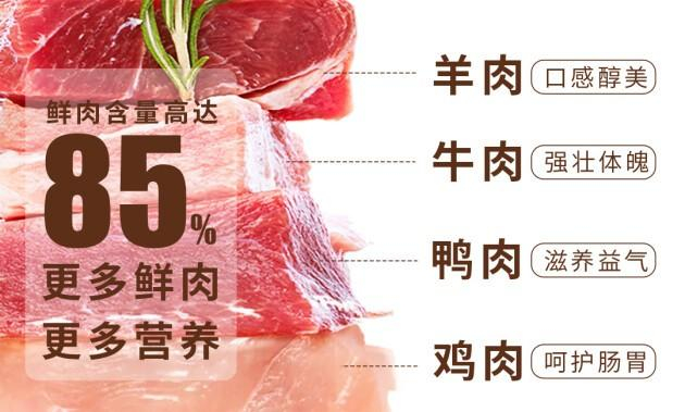 食材来源天然纯正,高鲜肉含量,还原爱宠采食天性