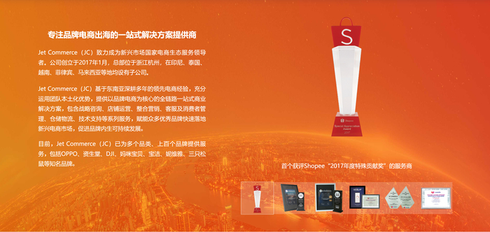 Jet Commerce基于东南亚深耕多年的领先电商经验,充分运用团队本土化优势,提供以品牌电商为核心的全链路一站式商业解决方案,包含战略咨询、店铺运营、整合营销、客服及消费者管理、仓储物流、技术支持等系列服务,赋能众多优秀品牌快速落地新兴电商市场,促进品牌内生可持续发展。