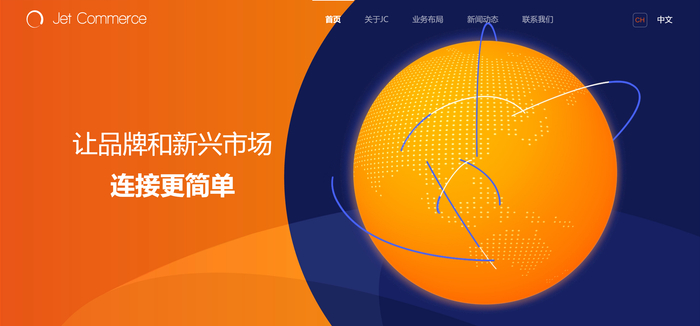 Jet Commerce新官网由蓝、橙两种品牌主色调构成,导航区采取简洁直观的分区模式,共划分为首页、关于JC、业务布局、新闻动态、联系我们五个板块页面。
