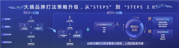 基于认知升级,张一鹏宣布升级品牌经营方法论STEPS 2.0。相较于STEPS1.0,STEPS2.0更强调“品牌自播”与“达人分销”结合,“公域流量加持”与“私域经营复购”结合,以及重视货维度选品策略。与此同时,再整体匹配“人货场”精细化运营,即公私域精细化运营、提供极致性价比货品、拓展营销场景等。