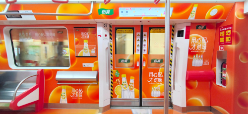这是围绕蜜水系列,所设计的活力橙色车厢,带给人满满的正能量,希望把快乐带给地铁乘客!地面是根据不同产品所设计的温情文案,希望通过这些走心文案,触动地铁乘客的心。