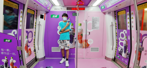 这是围绕葡萄假日和桃桃假日产品所设计的主题车厢,今年大热的粉紫撞色。在这里,葡萄假日,把紫色化成一场浪漫的邂逅!桃桃假日,让粉色少女情怀在这里徘徊!