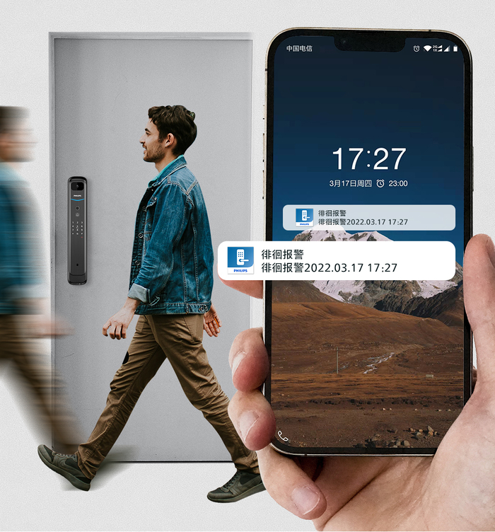 飞利浦智能锁DDL702-VP-5HW内面板设置了4英寸IPS显示屏,一旦有人按响门铃,显示屏便会自动亮起,让你可以轻松查看门外访客,而且门铃消息还会自动同步至手机APP,点击接通即可与访客双向对讲,远程查看门外情况。另一方面,飞利浦智能锁DDL702-VP-5HW还内置了PIR传感器,门外3m范围内一旦出现异常逗留行为,门锁就会及时抓拍录制门外情况,并将告警信息推送至手机APP,实现智慧防御。有了飞利浦智能锁这个24h保家护院的“守卫员”,用户可以卸下身体上和心理上的双重负担,轻松出门。