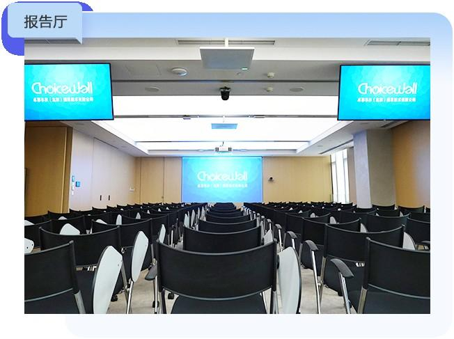 报告厅,利用技术来支持营造沉浸式的氛围,综合音视频、专业灯光照明、声学性能、环境和场景等因素,以震撼和美观的方式传达战略。