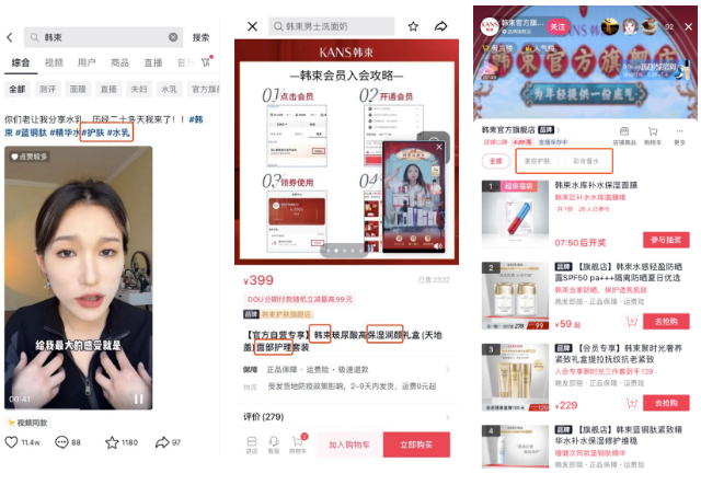 其中珀莱雅日常稳定直播,通过打造创意直播间以及持续发布专题类高质量短视频和长期合作优质达人,让有效内容占据搜索结果页面,提升曝光度。同样韩束在「抖音电商罗盘」诊断后,针对韩束、护肤品等关键词补充了短视频内容,由每月 50 条提升到了每月 300 条,大幅提升品牌曝光。