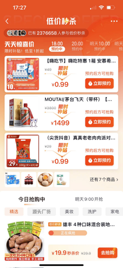 例如在秒杀频道中,设置了 20 款低用户决策、高转化能力的福利商品,价格都低于 19.9 元,进行拉新引流。而在百亿补贴频道,则是有 20 款各子品牌的拳头产品。通过这些货品的分层组合,增加「货」的展示机会,让更多人看到。