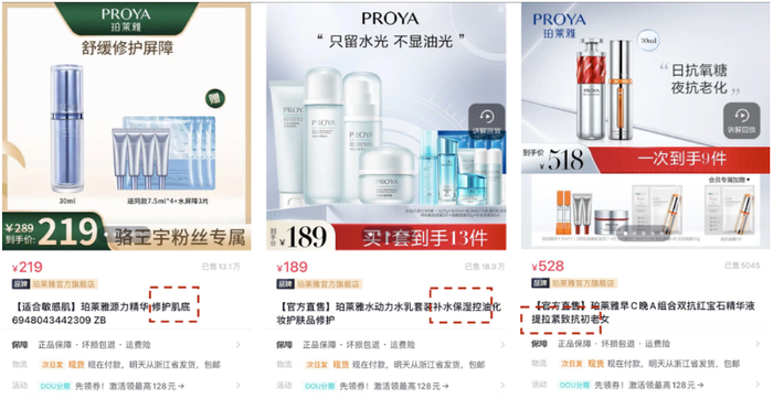 还有一种方式是通过爆品吸引用户关注。 因为爆品本身就拥有较强的认知度和吸引力,通过爆品组合以及宣推,同样能制造亮点。珀莱雅将全网爆款产品双抗精华以及红宝石精华引入商城,带动品牌今年 4 月产生 8 款百万 GMV 爆款商品。