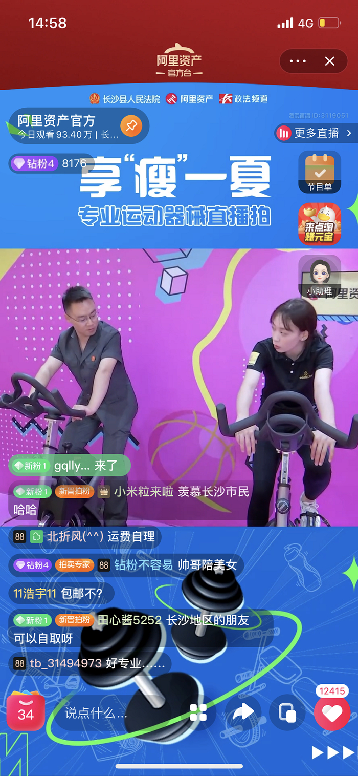 近日,湖南省长沙县人民法院、淘宝网阿里资产平台、长沙电视台政法频道联合推出了一期夏日特别版的网络直播——《享“瘦”拍一“夏”,健身器械法拍专场》。两个小时的直播时间里,吸引4万多人次围观,3万多次点赞,成为当地法院法拍直播的创新之举。