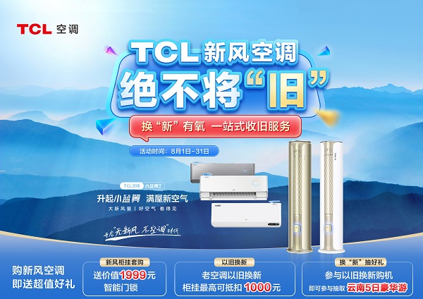 TCL空调积极响应国家号召,迅速开展“绝不将‘旧’”以旧换新惠民活动。8月1-31日期间,老空调以旧换新,最高可抵扣1000元;参与以旧换新购机活动即可参与抽取云南5日豪华游;购买新风柜挂套装,送价值1999元智能门锁。