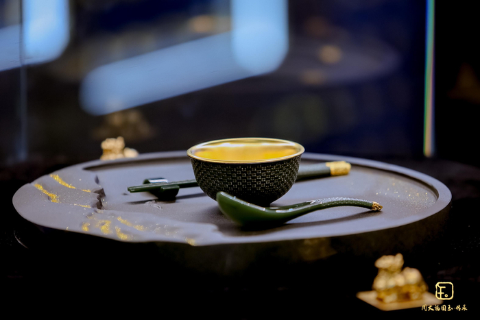 「金锦玉食器」由足金玉羹碗、镶金玉筷与镶金青玉汤匙组成,金碗玉食,衣钵相继,寓意前程似锦、丰衣足食,家庭和和美美。
