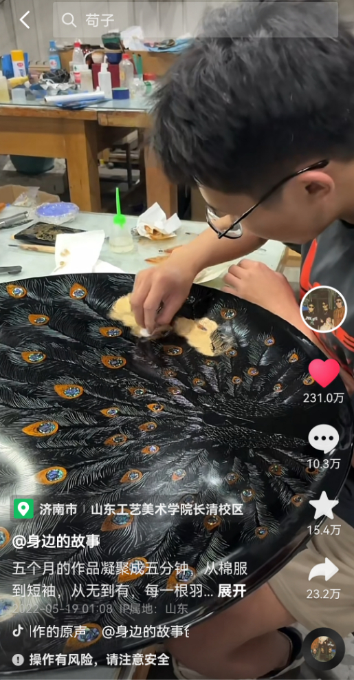 谈及参与这次“抖音青年艺术家计划”的感受,李文龙说:“我要做的,不仅是宣传传统艺术之美。更希望大家对漆器有所认知。这是沉淀了我们这些青年作者思考的作品、代表了我们(这代人)水平的作品。”