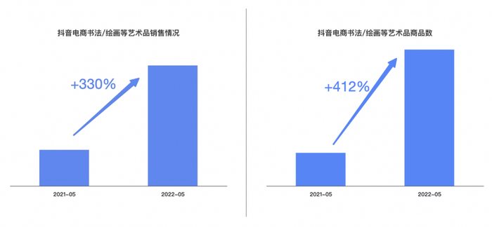 以书法绘画等艺术品为例,近一年来,抖音电商类目关联商品总数同比增长412%,月销售总额同比增长330%。新的兴趣电商模式,也正在为艺术行业注入新活力。