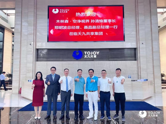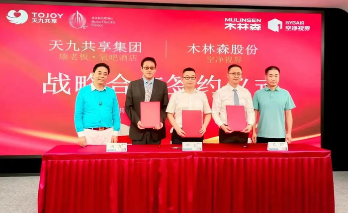 2022年8月2日,木林森股份旗下高端品牌空净视界智能科技有限公司(以下简称:空净视界)、天九共享控股集团(以下简称:天九共享集团)强强联合,双方于天九共享集团北京总部签署共同打造“康老板氧吧酒店”战略合作协议。