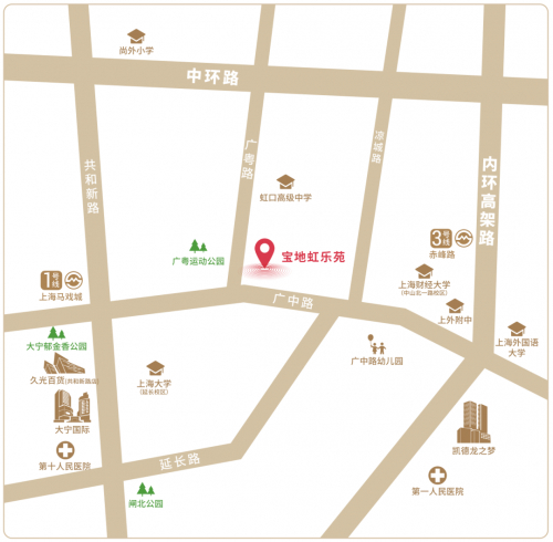 宝地虹乐苑位于虹口区广粤路76弄,地处广粤路广中路交界处,东临内环高架,北依中环高架,自驾距内环、中环、南北高架仅5分钟车程,交通出行便捷。