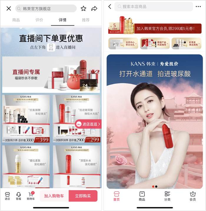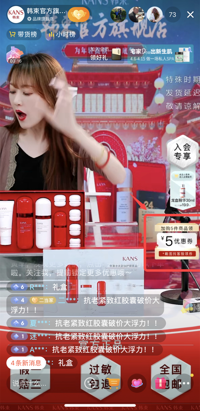 比如,韩束会在直播间通过竖版标引导用户「收藏加购5件产品即可领5元券」,刺激用户加购,增加直播间互动性、福利感的同时,也提升了商品在商城场景下的推荐机会。