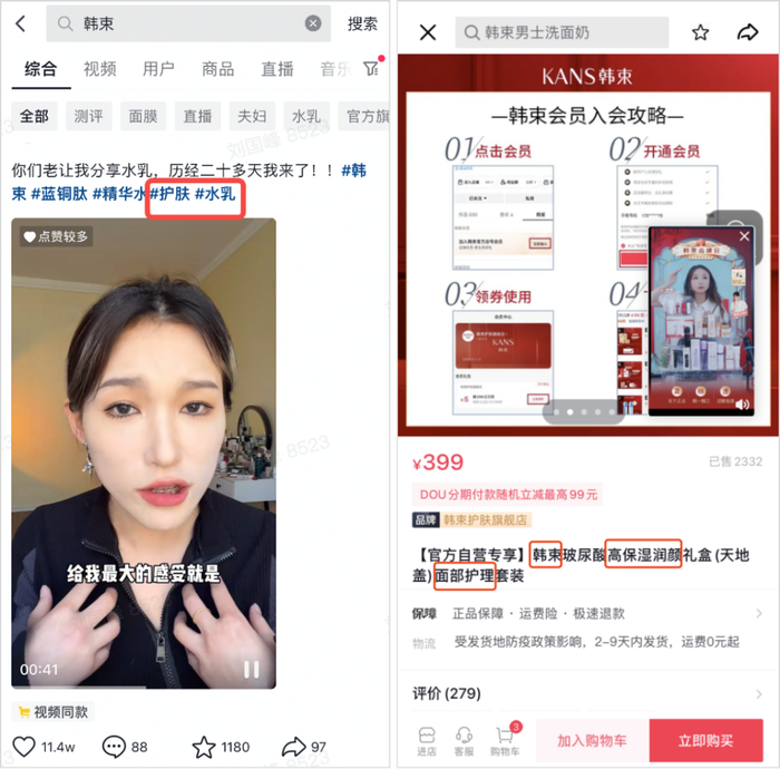 比如,护肤品牌珀莱雅为了保证用户搜得到,日常稳定自播,且持续发布专题类高质量短视频,还长期合作优质达人,有效提升内容和商品的曝光度。再如,韩束则在通过电商罗盘诊断发现品牌的搜索流量低于行业水平后,针对「韩束」「护肤品」等高GPM的词补充短视频内容,从每月50条提升至每月300条,大幅提升搜索曝光机会。