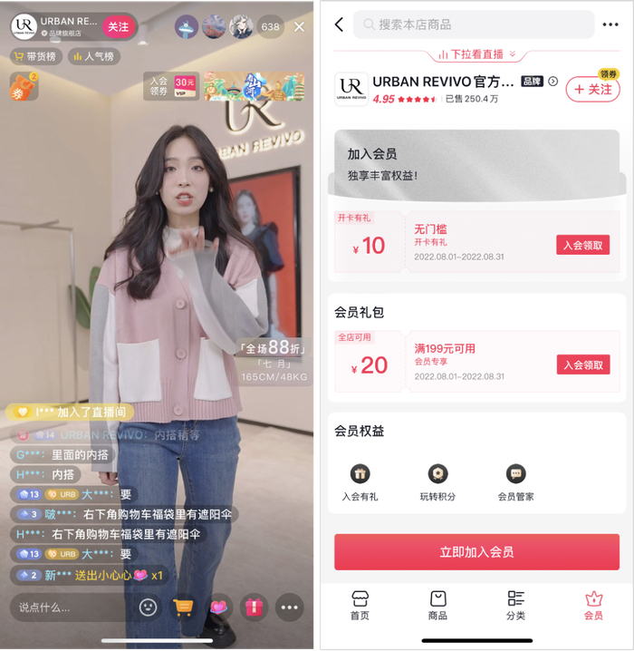 首先是入会引导。UR会通过直播间话术、店铺首页置顶、店铺精选页大图等用户入口,以入会无门槛优惠券、福利礼包等形式引导用户成为会员,入会率能达到6.6%。抖音电商官方也鼓励品牌建立直播间粉丝体系,加强观看直播到成为会员的能力建设。