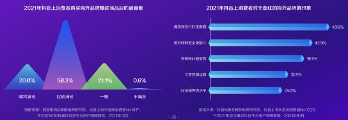 此外,数据显示,消费者对于走红的海外品牌印象最深的要数“满足个性化需要”,共有48.9%的用户选择,这也印证了抖音电商以用户兴趣为导向,将能助力海外品牌更有针对性的销售,消费者也更容易买到符合自己预期的好物,帮助品牌商家完成口碑建设,58.3%的抖音消费者对使用的海外爆品表示“比较满意”。