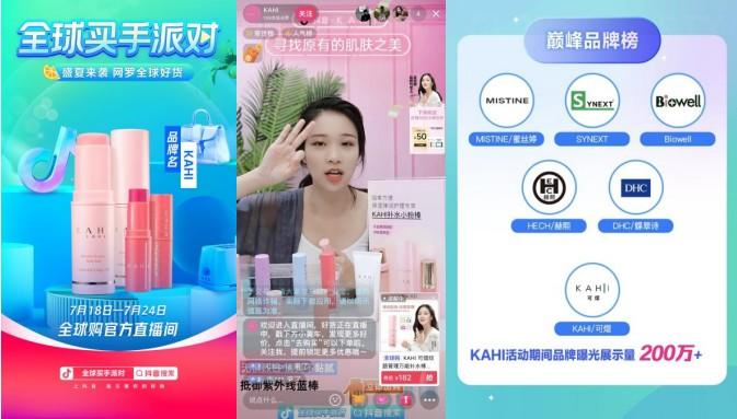 跨境电商直播也为卖家带来新的引流渠道,许多海外品牌商家纷纷亲自布局直播赛道。以@KAHI为例,作为海外新锐品牌,其选择抖音电商平台作为主要的线上销售渠道。除了联合多层级KOL进行低成本试水市场,还在直播过程中应用了其他商业产品进行品牌曝光,活动期间,KAHI品牌曝光量20万+ ,极大增强了品牌认知度。具体来看,KAHI通过制定专属开屏页广告,在直播间植入商品贴片广告等,持续刺激用户感知,成功打造“KAHI 可熠纹路管理小粉棒9g”这一爆品,单品爆发系数达466% 。