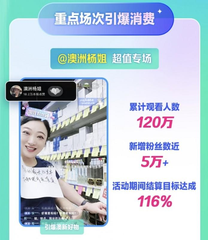 以达人主播@澳洲杨姐为例,通过亲自下场保税仓营造正品溯源场景,精细化覆盖“都市银发+中等收入群体+小镇中老年”目标群体,配合生动的解说,创造出了更大的乘数效应,在跨境膳食营养品专场中达成了3万人成交,最高在线1.76万人的亮眼成绩。