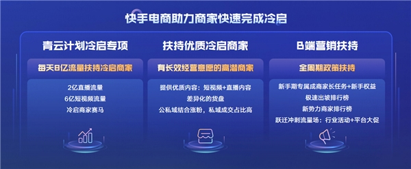 专属流量扶持外,针对商家在冷启阶段面临的冷启周期长、定位不精准、投放回报低、涨粉难、起号难、货盘差、看数据难、直播节奏差等一系列问题,快手电商还推出了全周期政策优惠、工具产品赋能支持、专人1V1运营支持、教育课程体系等全体系商家扶持。