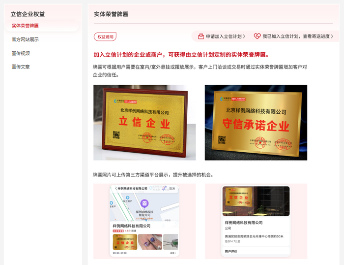 1、优质信用企业加入立信计划,获颁立信计划定制的实体荣誉牌匾,线下彰显企业信用;
