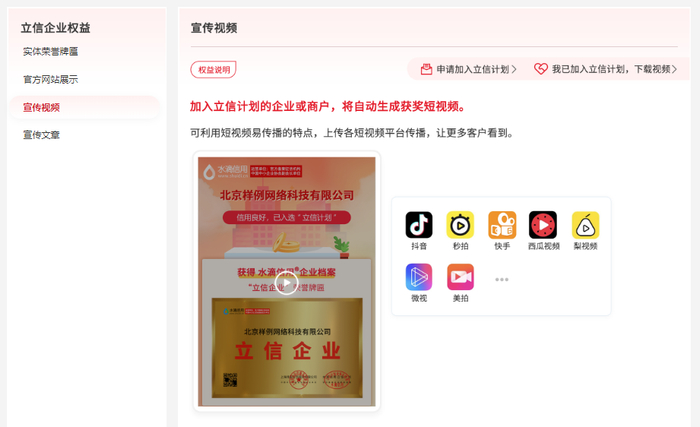 3、优质信用企业加入立信计划,获得立信计划生成的企业信用宣传短视频,让更多客户看到;