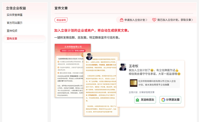 4、优质信用企业加入立信计划,获得立信计划生成的企业获奖文章,特定群体宣传可信形象;