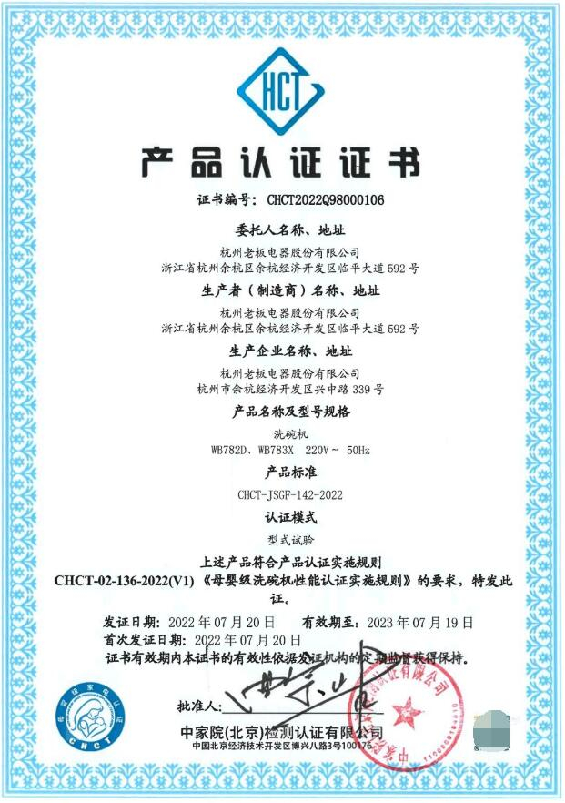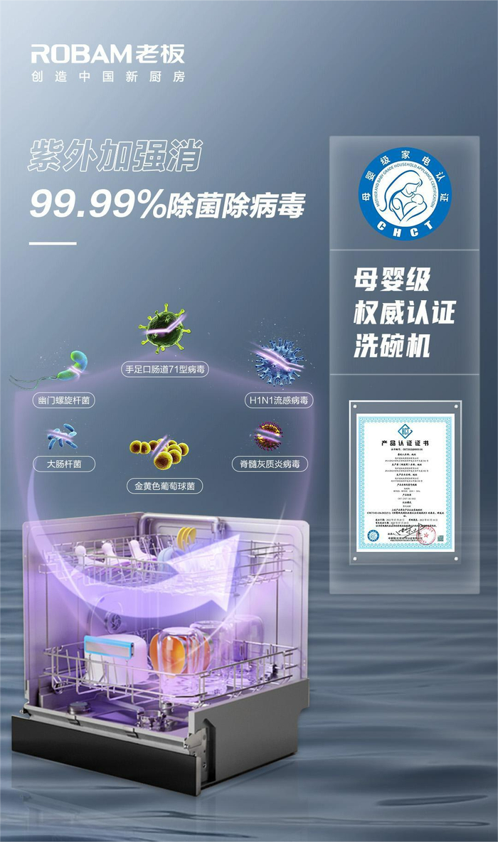 相比普通洗碗机,老板母婴级洗碗机WB782D新增深层紫外照射除菌功能,餐具经过UV紫外线照射可穿透微生物细胞膜和细胞核,破坏DNA,使其失去复制能力和活力,从而起到杀死细菌作用。根据广东省微生物分析检测中心检测报告显示,WB782D可有效杀死“幽门螺杆菌、金黄色葡萄球菌、甲型H1N1型流感病毒、肠道病毒71型、大肠杆菌、脊髓灰质炎病菌”六大常见病菌,除菌除病毒率高达99.99%。出色的除菌能力,也让这款洗碗机获得了由中家院(北京)检测认证有限公司颁发的“母婴级”洗碗机认证证书,它不仅为消费者选购母婴级洗碗机提供了科学有效参考,也是母婴级家电好产品的最佳证明。