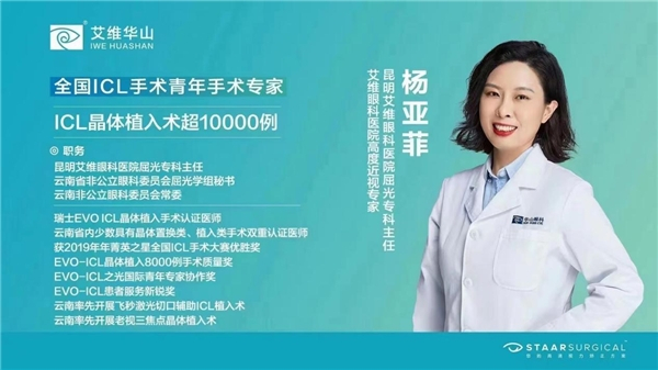 近视手术专家、昆明艾维眼科医院杨亚菲医生不负“云南ICL女王”称号,于今年8月5日,率先代表云南眼科医疗界在博鳌圆满完成了EVO+ Visian ICL(V5)晶体植入手术。