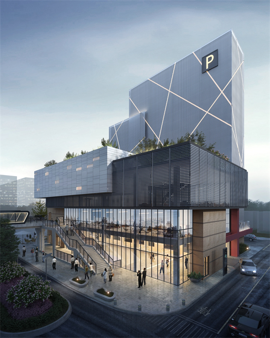 车库建筑同时与商业用房相互衔接,在商业用房屋顶进行整体景观绿化设计,在周边高层建筑的环视之下其第五立面与相邻的玉海广场有机的融为了一体。