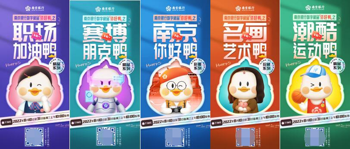 “职场加油鸭”,以年轻职场人为现实原型,表达了年轻人既理性,又自由,既乐观积极,又充满个性的生活态度。“赛博朋克鸭”,定位科幻流派美术风格,作为元宇宙中最流行的“赛博朋克”风的承载者,向年轻客群传递南京银行金融科技力量。“潮酷运动鸭”,通过用各种潮酷装备打造“你好鸭”,向世界展示南京银行与拥有者共同具备的运动健儿般专注始终、勇于突破、持续奔跑、百折不挠的青春姿态。“名画艺术鸭”,则是以各种世界名画为蓝本完成“你好鸭”的卡通艺术再加工,在活泼有趣的形象背后,充分凸显拥有者对于古典和文艺的文化认同。“南京你好鸭”,作为南京银行数字藏品“你好鸭”中的彩蛋款,结合南京特有的城市元素和人文底蕴,传递南京“博爱”城市精神,彰显南京银行开放、融合的视野与格局,将古老的南京城投射在元宇宙世界中再放异彩。