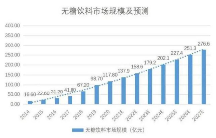 《2021中国无糖饮料市场趋势洞察报告》显示,在2020年,国内的无糖饮料的市场规模已经达到了117.8 亿元,并将持续增长。预计到2025年,无糖饮料市场规模将增至227.4亿元规模,2027年继续增至276亿元。