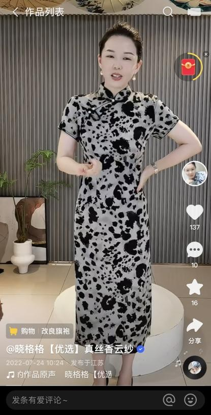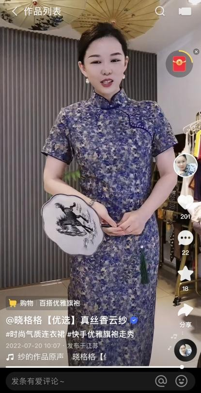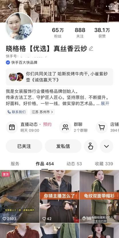好面料,好价格,一针一线,做实“穿”的艺术品。在傻格格的快手主页,如是写着品牌承诺。据高春晓介绍,自己最早是在苏州做旗袍档口生意的,以旗袍批发为主,年销售额在200万至300万左右。