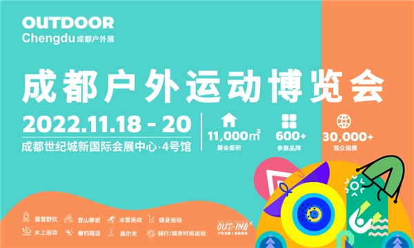 2022年11月18~20日,2022 OUTING X西部户外生活节暨成都户外运动博览会(下文简称:2022成都户外展)将在成都世纪城新国际会展中心盛大举办。本届展会规模11,000平方米,汇聚600多个品牌集中亮相,预计将吸引超3万行业人士及爱好者参观采购。以“多元运动+场景化展示+沉浸式体验”的独特形式,充分融合成都雪山下的公园城市地理优势,2022成都户外展将为西南地区带来一场极富专业性与娱乐性的大型户外运动嘉年华。现距离展会开幕仅剩100天,诚邀登记报名,共赴户外行业年度盛会,续话千年蓉城冰雪奇缘。