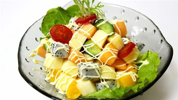 选用5-6种孩子喜欢的水果切块,配合蜂蜜,沙拉酱,糖,番茄酱。水果洗干净了也不要直接吃哦,把水果放盐水中浸泡一会儿。准备一个碗,把沙拉酱,蜂蜜等倒入碗中拌匀,调好后把水果沙拉汁均匀地淋在水果上即可,放冰箱冷藏一下吃起来更爽口,更开胃。