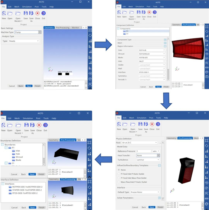 AICFD 2022版本通过结合旋转机械仿真设置的特点,将整个前处理流程设置模板化,一步步引导用户操作,降低使用门槛,减少对仿真工程师CFD理论基础的要求。向导模式中,在关键步骤均设置了错误检查机制并及时提示,避免用户遗漏或错误设置。模型初始化后,自动创建对应边界条件和交界面属性,减少前处理设置的工作量。