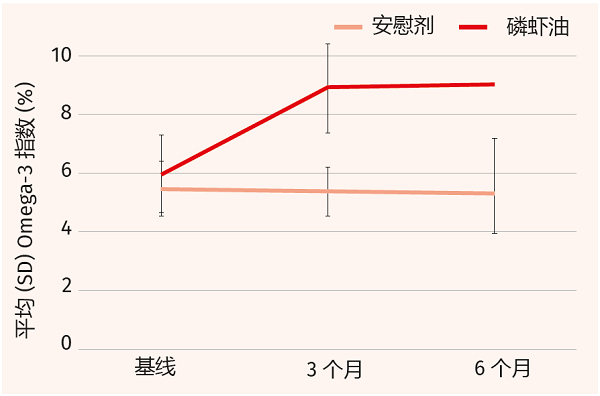 此外,磷虾油组的Omega-3指数水平从初始的6.0%,三个月后上升到8.9%,六个月后上升到9.0%。