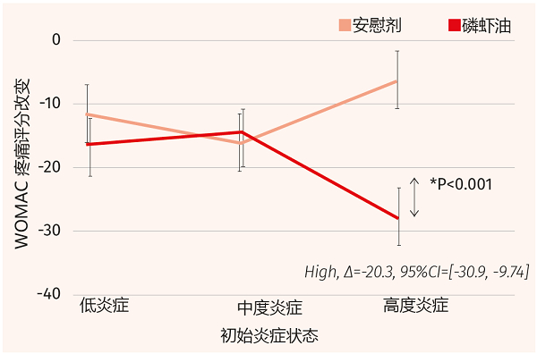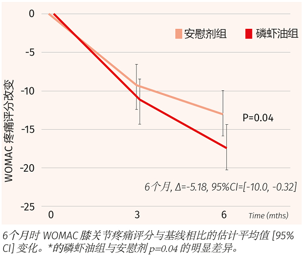 该研究表明,与安慰剂组相比,磷虾油组的膝关节疼痛在六个月内有所改善。此外,与安慰剂相比,磷虾油组的膝关节僵硬和身体功能有更大的改善。膝关节结果使用西安大略和麦克马斯特大学关节炎指数(WOMAC)数字量表进行评估,这是评估髋关节和膝关节骨关节炎的黄金标准方法。