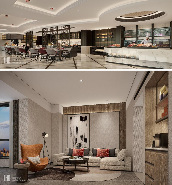 大气沉稳、优雅商务的设计质感,打造中西结合、兼收并蓄的现代艺术休憩场所。FHD酒店设计利用开阔灵活的空间规划,营造舒适放松、温馨愉悦的社交氛围。典雅而潮流的设计风格,酒店整体氛围高级且潮趣。
